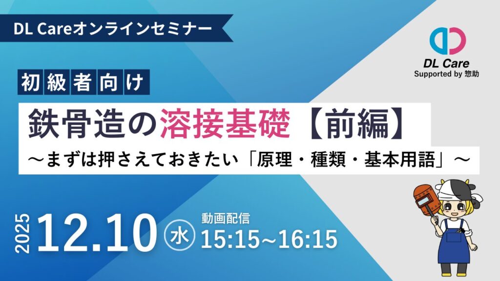 DL Careオンラインセミナー「鉄骨造の溶接基礎【初級編/前編】」 を 12月10日(水)15:15〜 公開いたします。